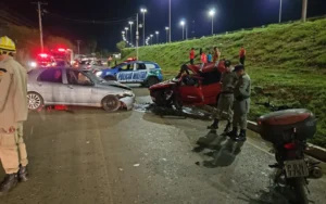 Os dois carros bateram de frente, informou o Corpo de Bombeiros. Uma das vítimas tinha ferimentos, mas se recusou a ser levada para o hospital.